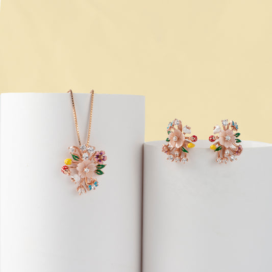 Rose Gold Floral Burst Pendant and Earring Set with Multicolored Gemstones