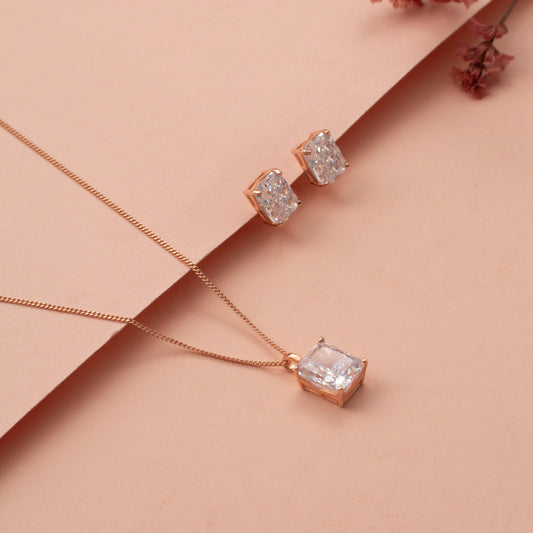 Rose Gold Square Solitaire Diamond Pendant and Earring Set