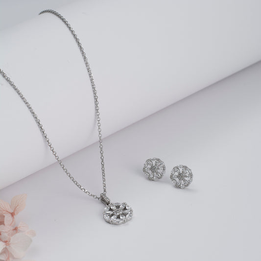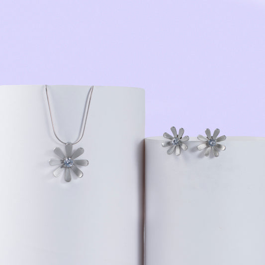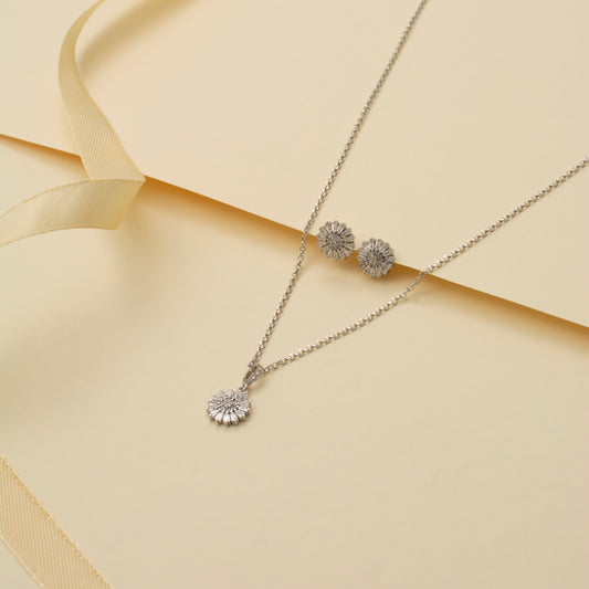 Silver Daisy Pendant and Earring Set with Diamond Centers