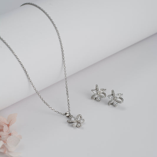 Silver Butterfly Pendant and Earring Set with Diamond Accents