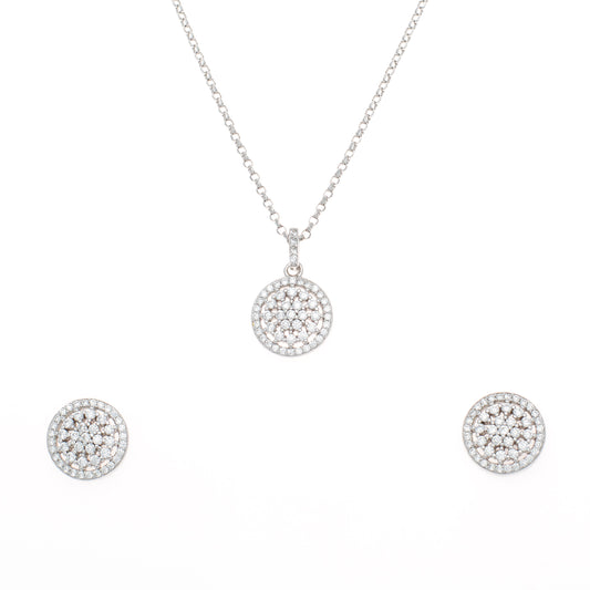 Silver Pave Diamond Disc Pendant and Earring Set