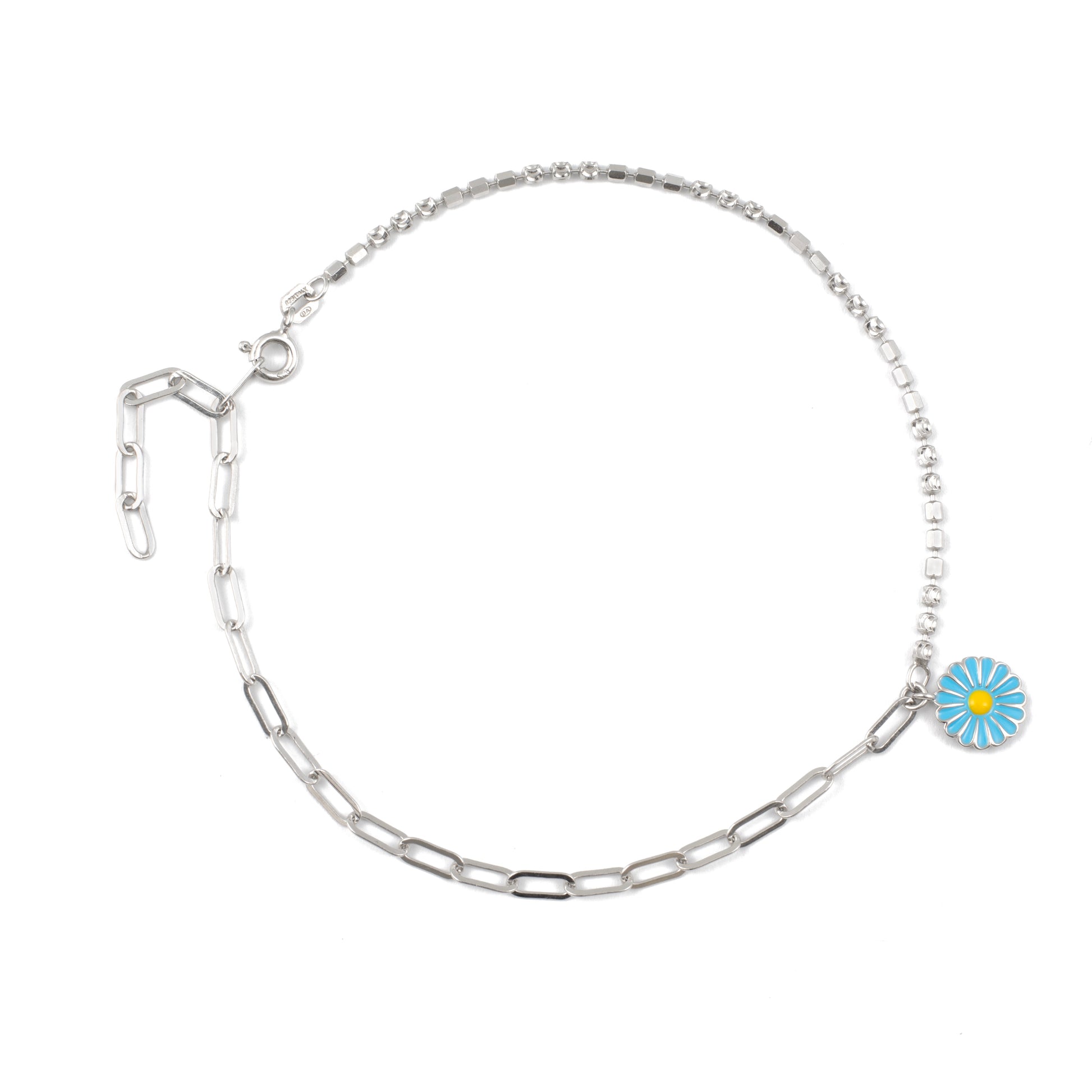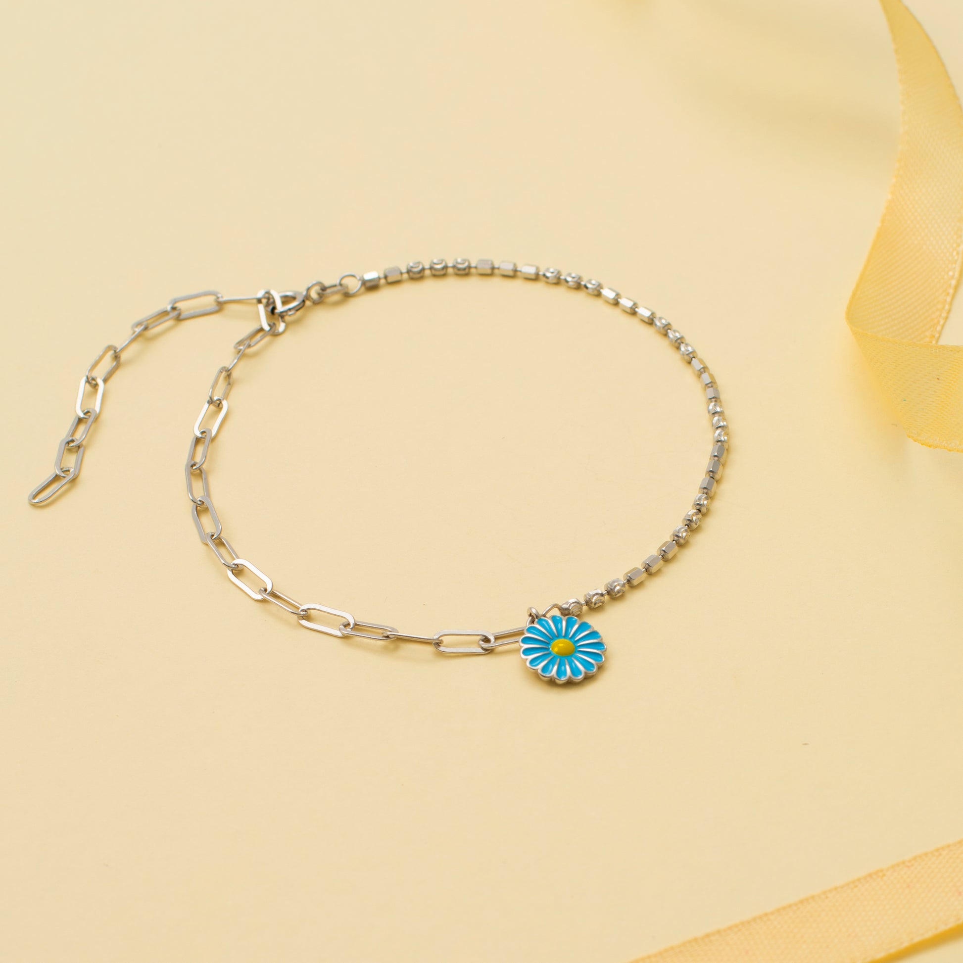 Elevate your style with this enchanting Silver Anklet, featuring a vibrant blue hanging flower charm and delicate diamonds on one side. The sleek silver chain pairs beautifully with the striking blue flower and the subtle sparkle of the diamonds, creating a chic and eye-catching accessory. Perfect for adding a touch of elegance and charm to your look, this anklet is a sophisticated addition to your jewelry collection.
