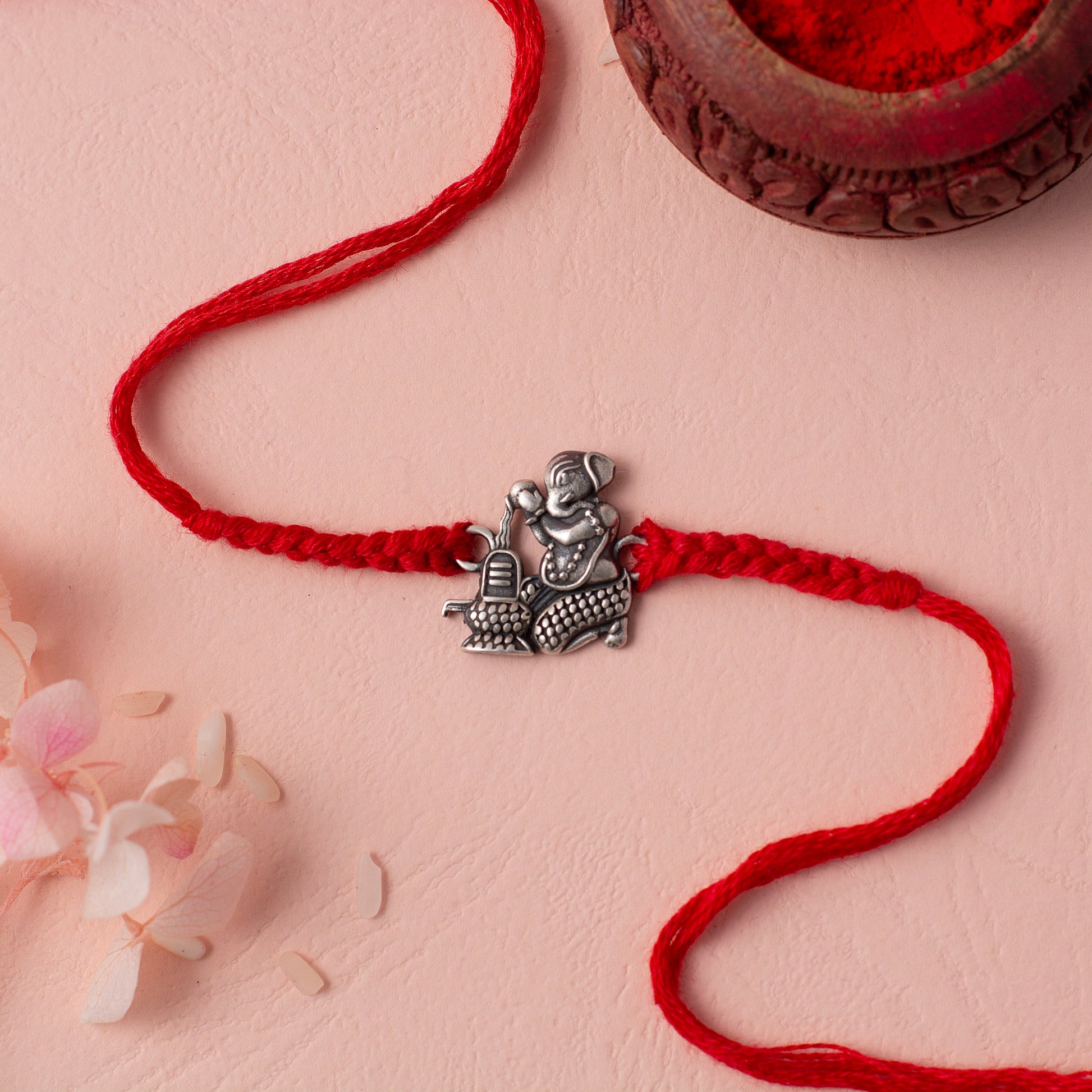 Imbue your Raksha Bandhan celebrations with divine blessings with our Ganesha Charm Rakhi. This beautiful rakhi features a silver-toned charm of Lord Ganesha, the remover of obstacles and the god of beginnings and wisdom. The charm is exquisitely crafted, showcasing Ganesha in a sitting posture, which brings a touch of spiritual elegance to the festival. Threaded on a robust red cord, symbolizing strength and protection, this rakhi is perfect for invoking divine blessings and expressing your heartfelt wishes for your sibling's well-being and prosperity.