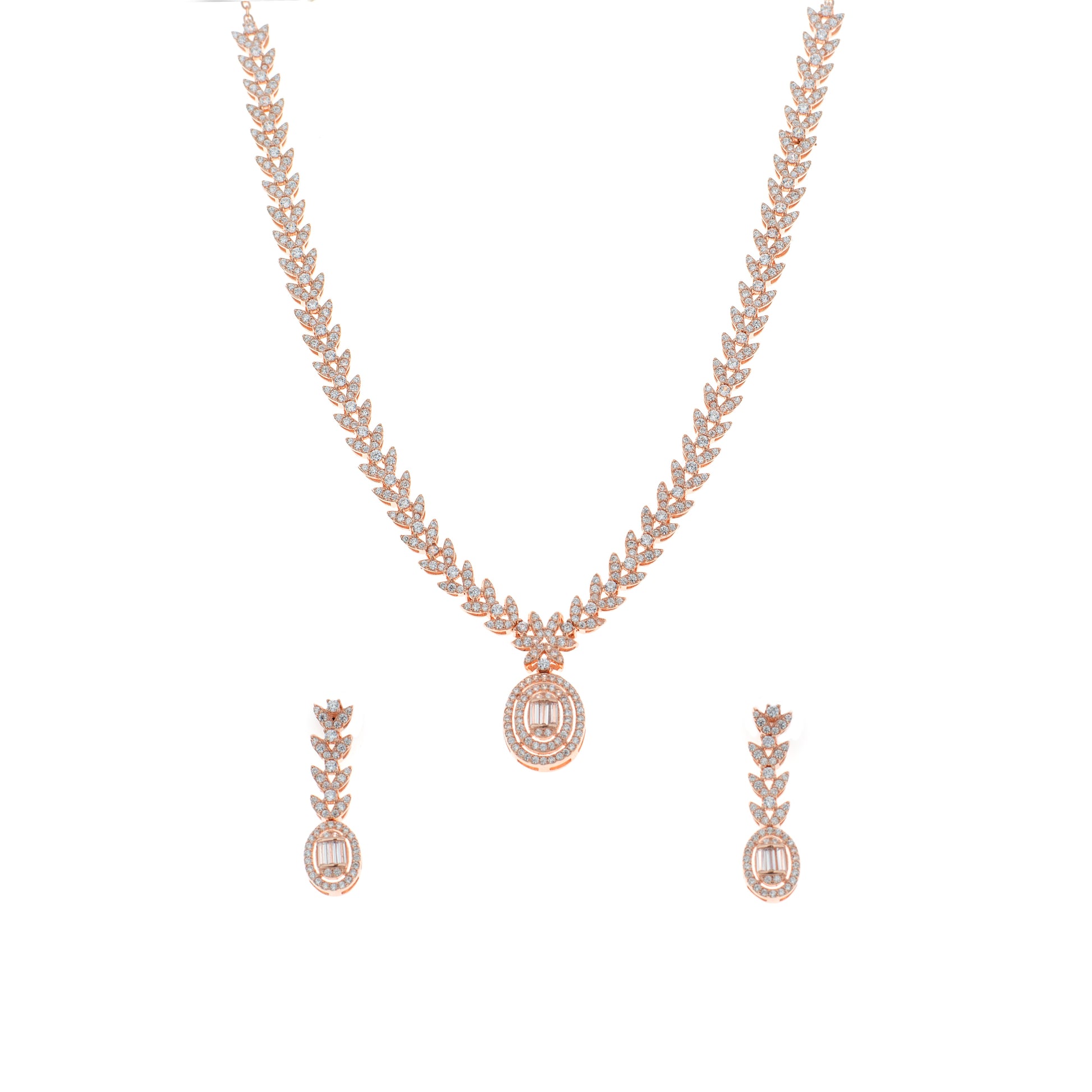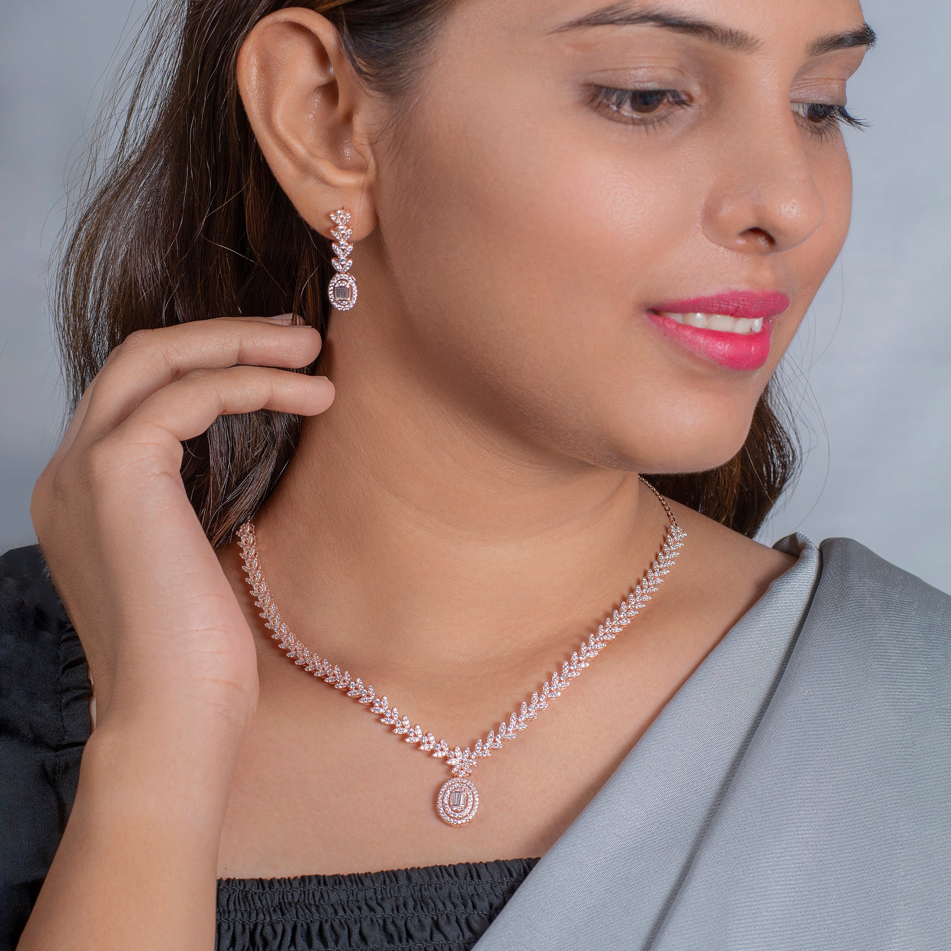 Elevate your style with this stunning Rose Gold Necklace paired with elegant long dangle earrings. The necklace features a sleek, modern design in radiant rose gold, while the matching earrings add a touch of sophistication with their graceful, elongated shape. Perfect for making a statement at any occasion, this set combines contemporary charm with classic elegance, making it a versatile addition to your jewelry collection.