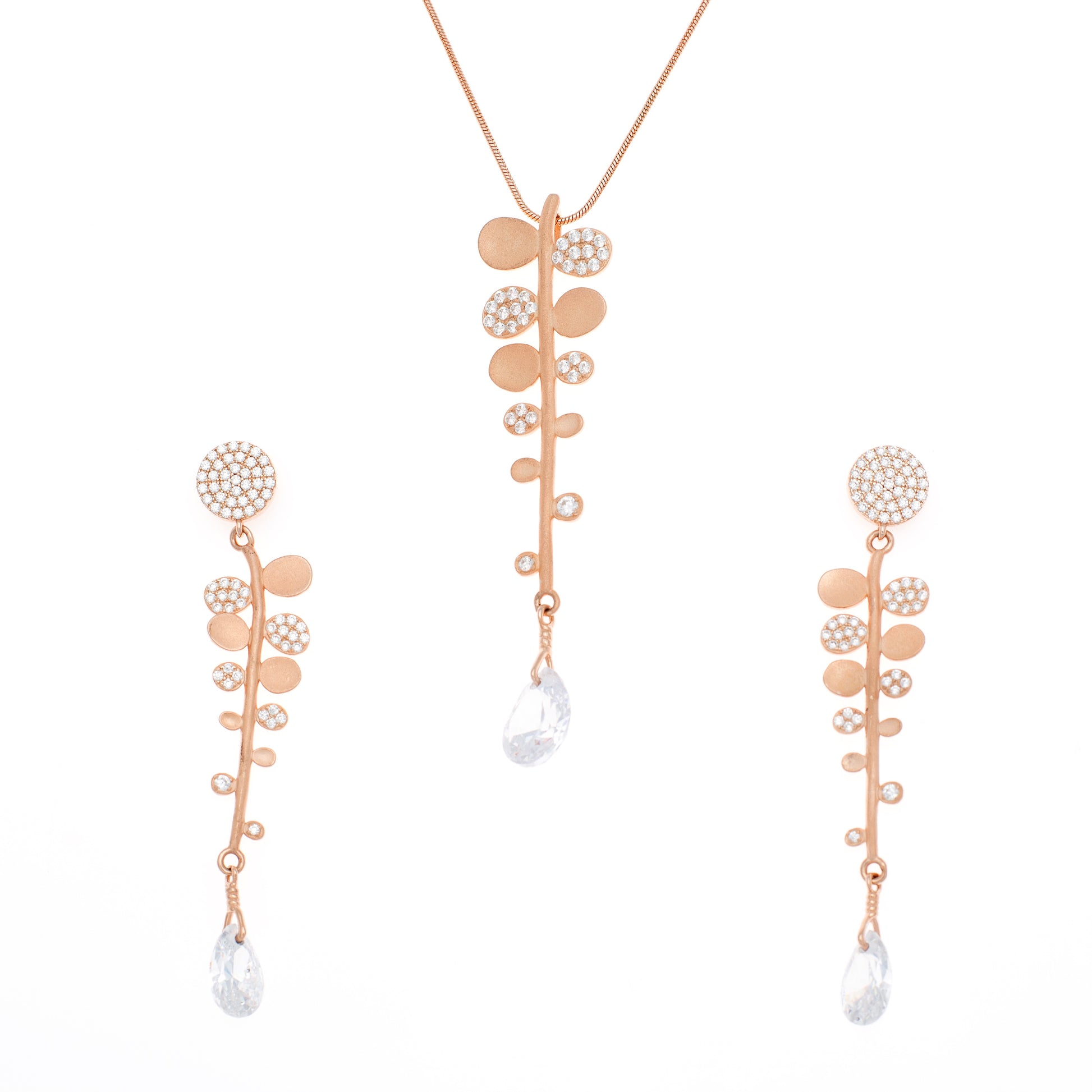 Rose Gold Vine Drop Pendant and Earring Set with Crystal Accents