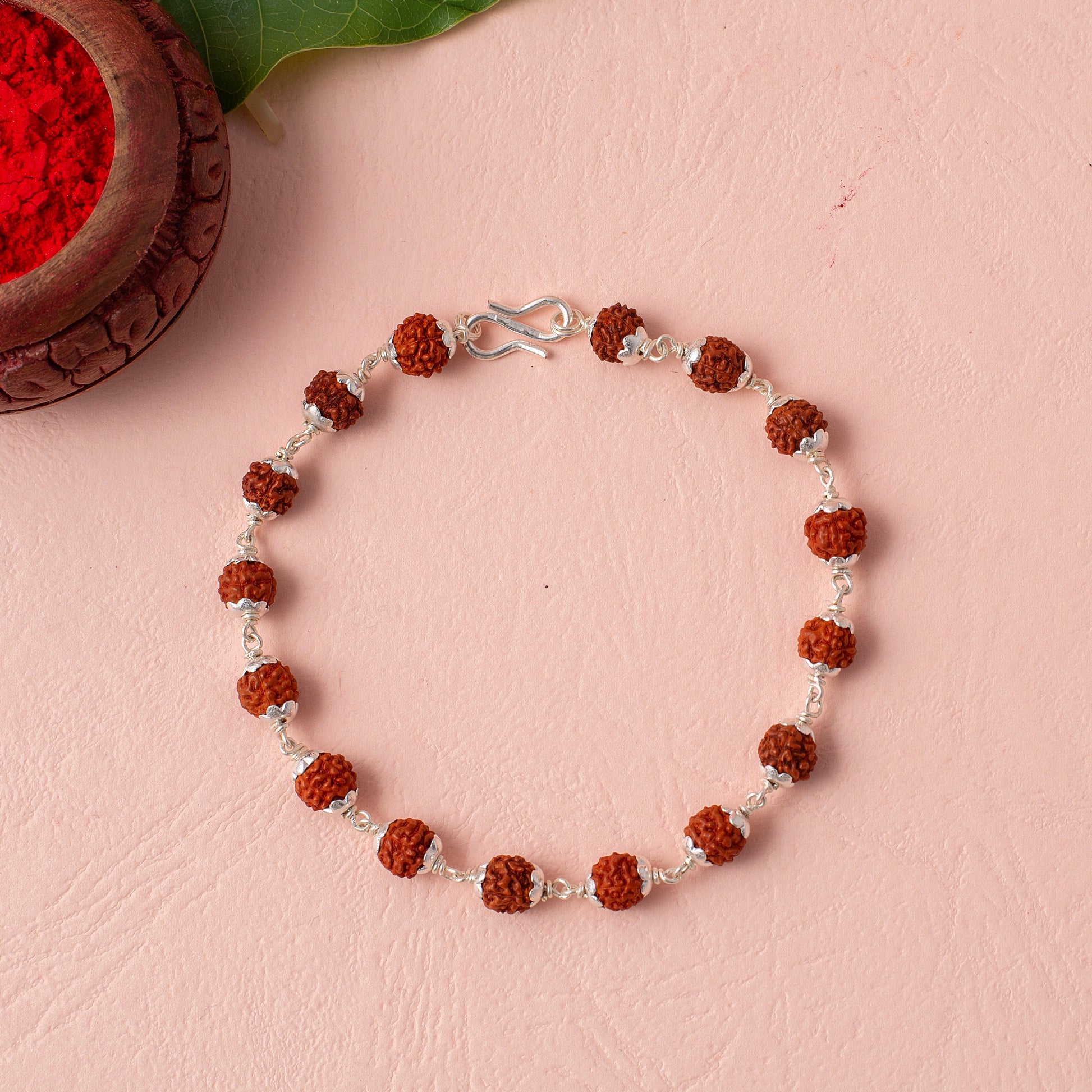 Celebrate the bond of protection with our Rudraksha Divine Harmony Rakhi Bracelet. Each bead on this bracelet is a Rudraksha, known for its profound spiritual significance and health benefits, often revered in connection with Lord Shiva. This Rakhi bracelet blends tradition with elegance, designed to be a versatile accessory for both festive occasions and everyday wear. Crafted with delicate sterling silver links that complement its spiritual charm, it features a secure clasp for a comfortable fit. Gift this as a rakhi to cherish the protective bond between siblings while embracing its holistic virtues.
