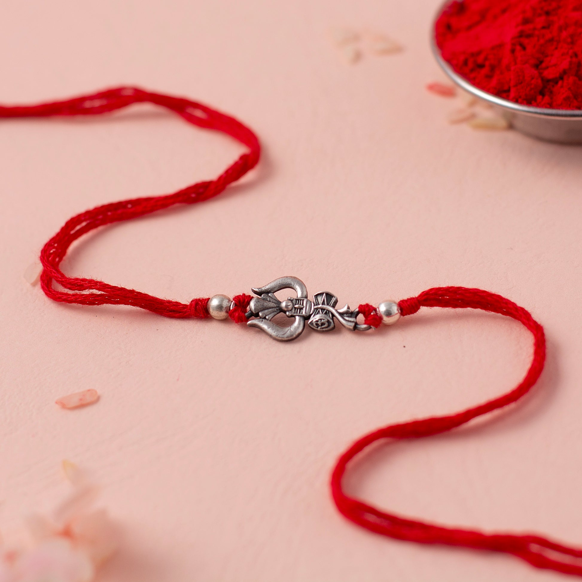 Celebrate the sacred bond of Raksha Bandhan with our Shiva's Trishul Emblem Rakhi. This rakhi features a meticulously crafted emblem of Lord Shiva's Trishul, a symbol of protection and power. Set on a durable, vibrant red thread, this rakhi combines spiritual significance with a touch of traditional elegance. The Trishul emblem, flanked by silver beads, serves as a reminder of the divine guardianship and blessings bestowed upon your brother. Ideal for those who hold deep spiritual and cultural values, this rakhi is more than just a decorative accessory—it's a protective talisman for the year to come.