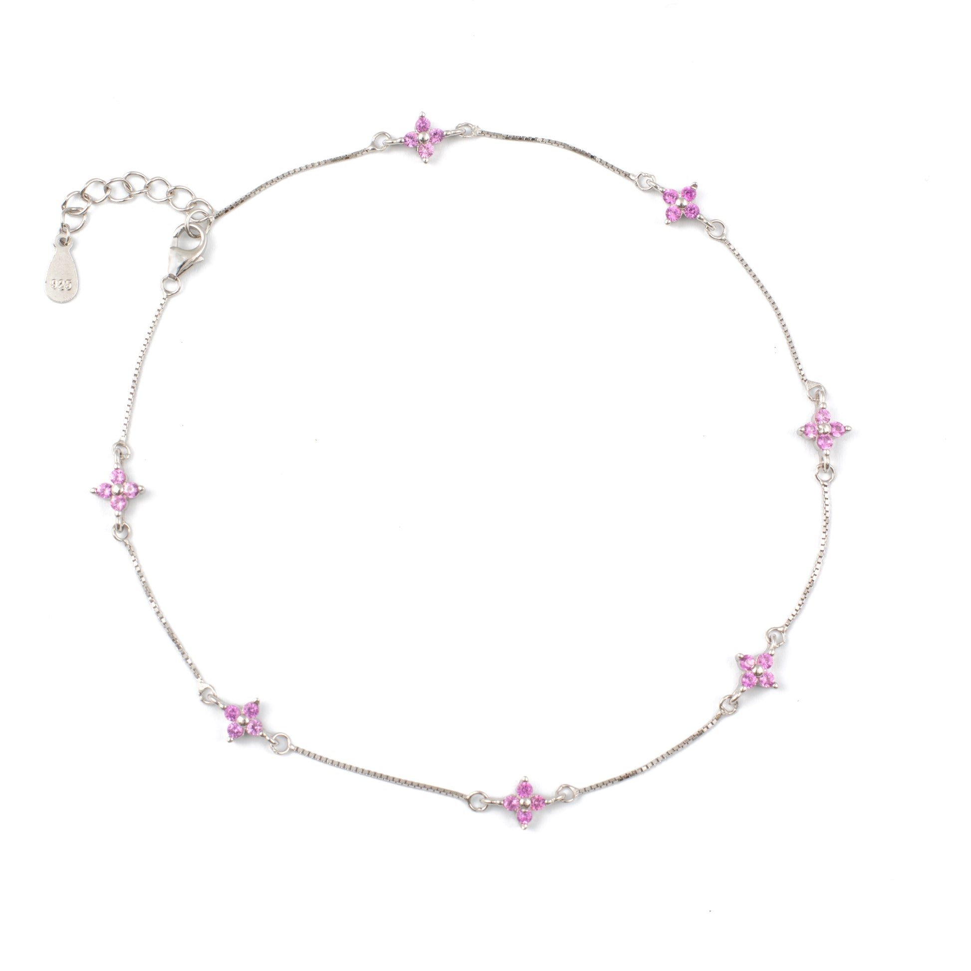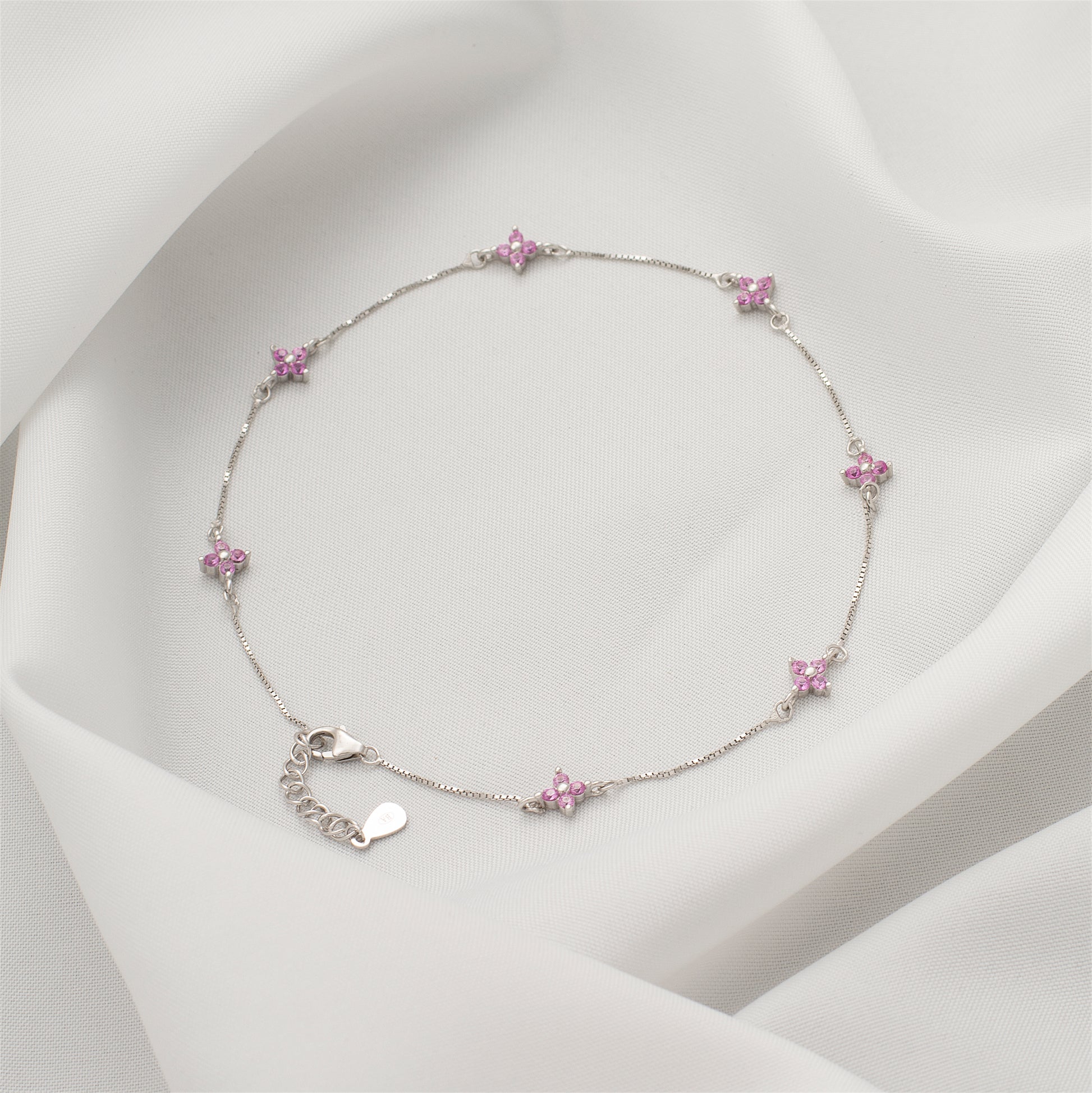 Adorn your ankle with this elegant Silver Anklet featuring a delicate pink diamond floral charm. The shimmering silver chain beautifully complements the sparkling pink diamond flora, creating a charming and feminine accessory. Perfect for adding a touch of grace to any outfit, this anklet is a must-have addition to your jewelry collection.