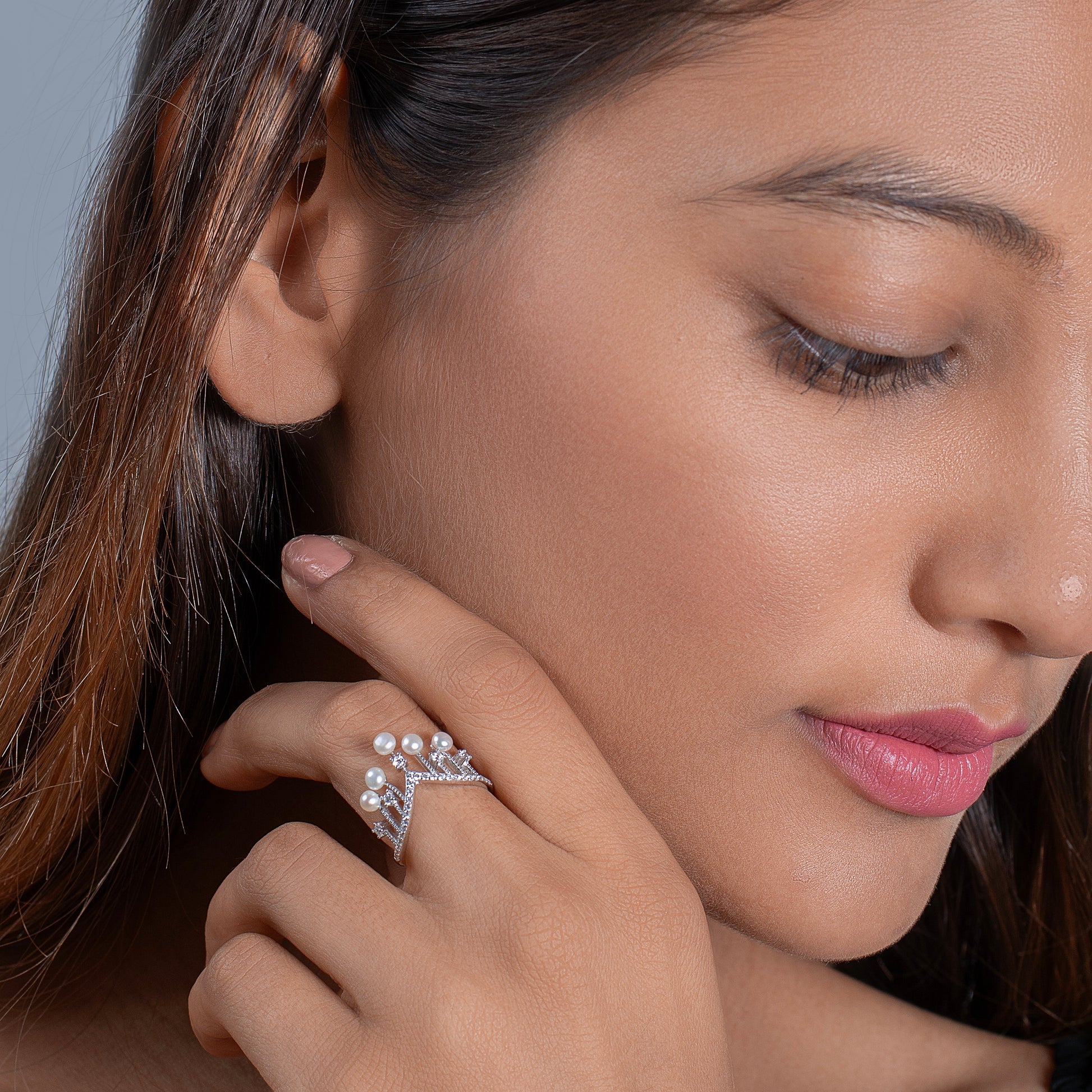 Silver Crown Ring with Pearls and Diamonds