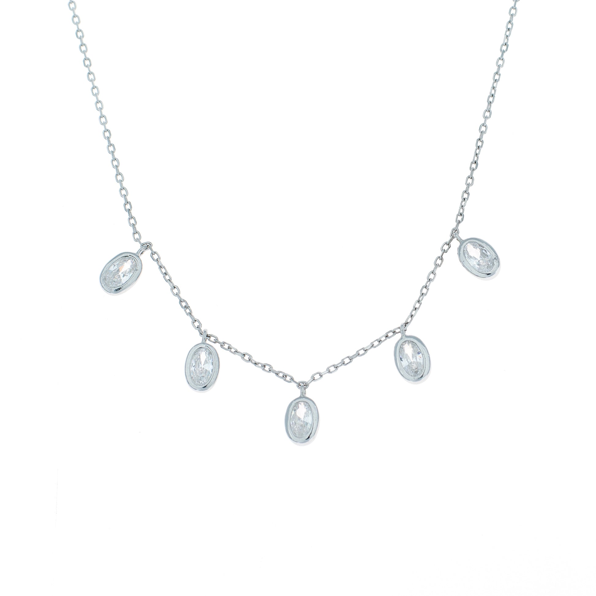 Elegant silver chain pendent featuring five dangling oval crystal charms. Each charm is a clear crystal set in a rose gold bezel, creating a delicate sparkle effect. The charms are evenly spaced along the chain, with the center charm slightly larger for a balanced look. This versatile piece adds a touch of glamour to both casual and formal outfits, making it perfect for everyday wear or special occasions. The warm tone of the silver complements the brilliance of the crystals, resulting in a romantic and feminine accessory.