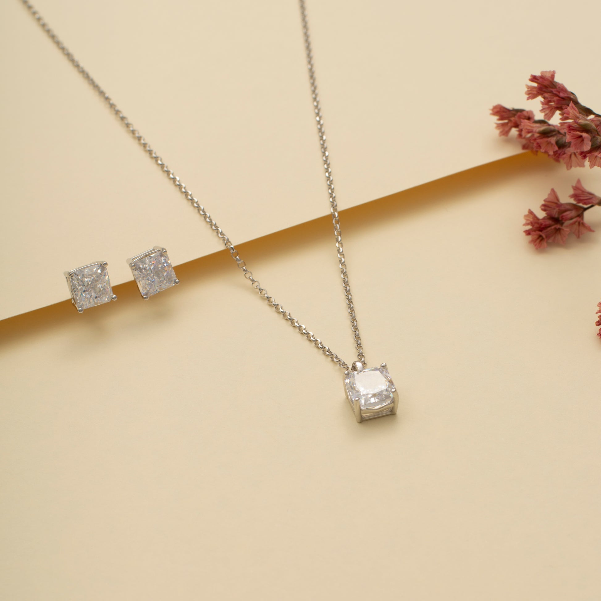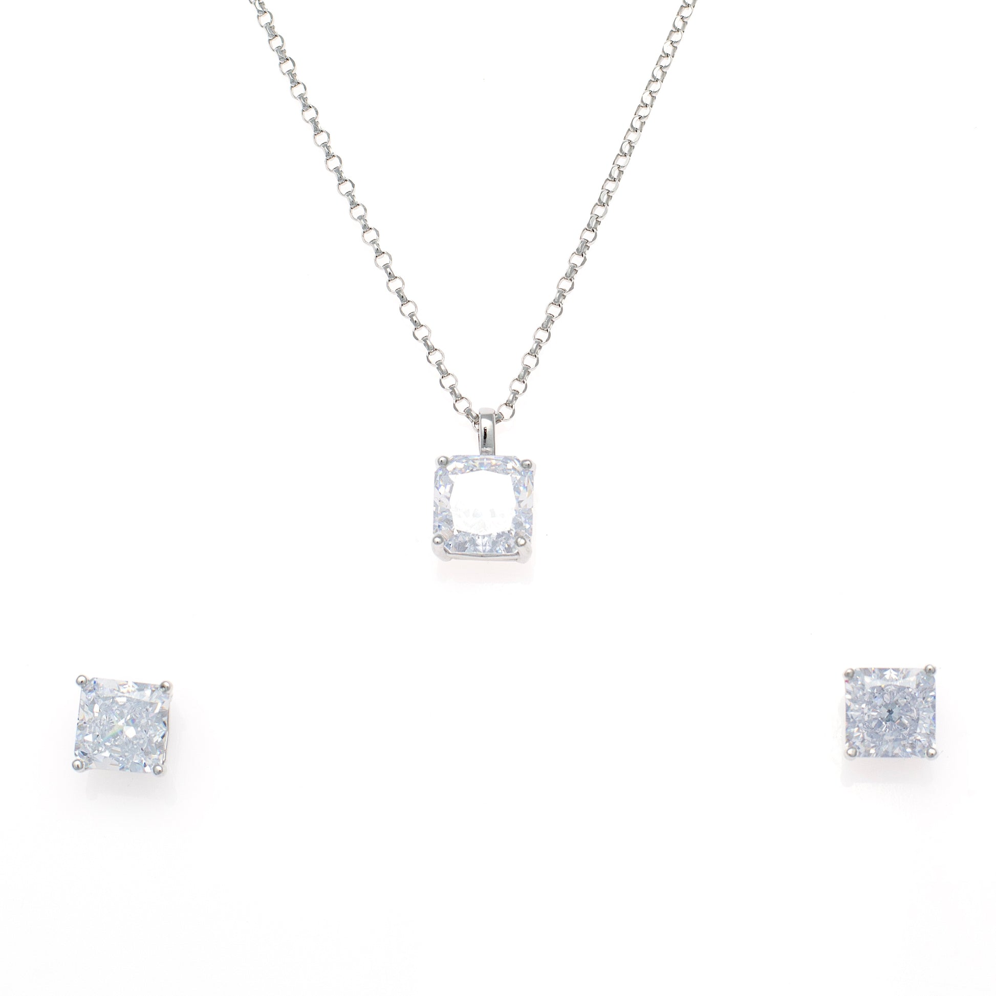 Rose Gold Square Solitaire Diamond Pendant and Earring Set