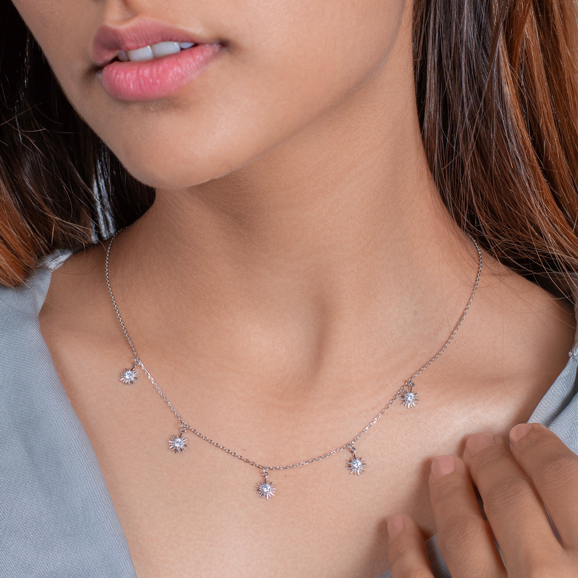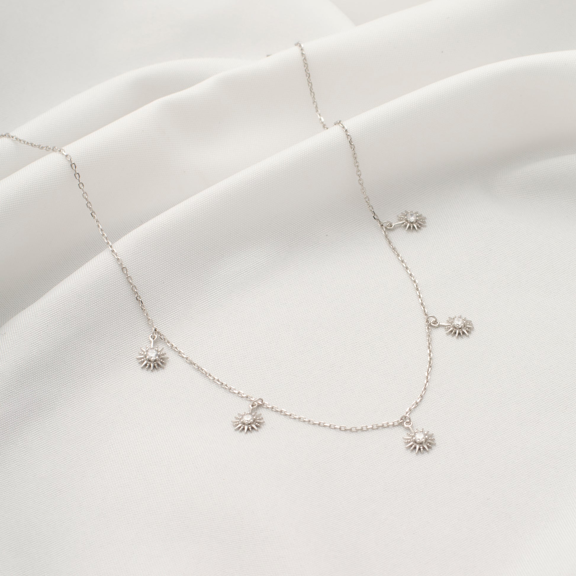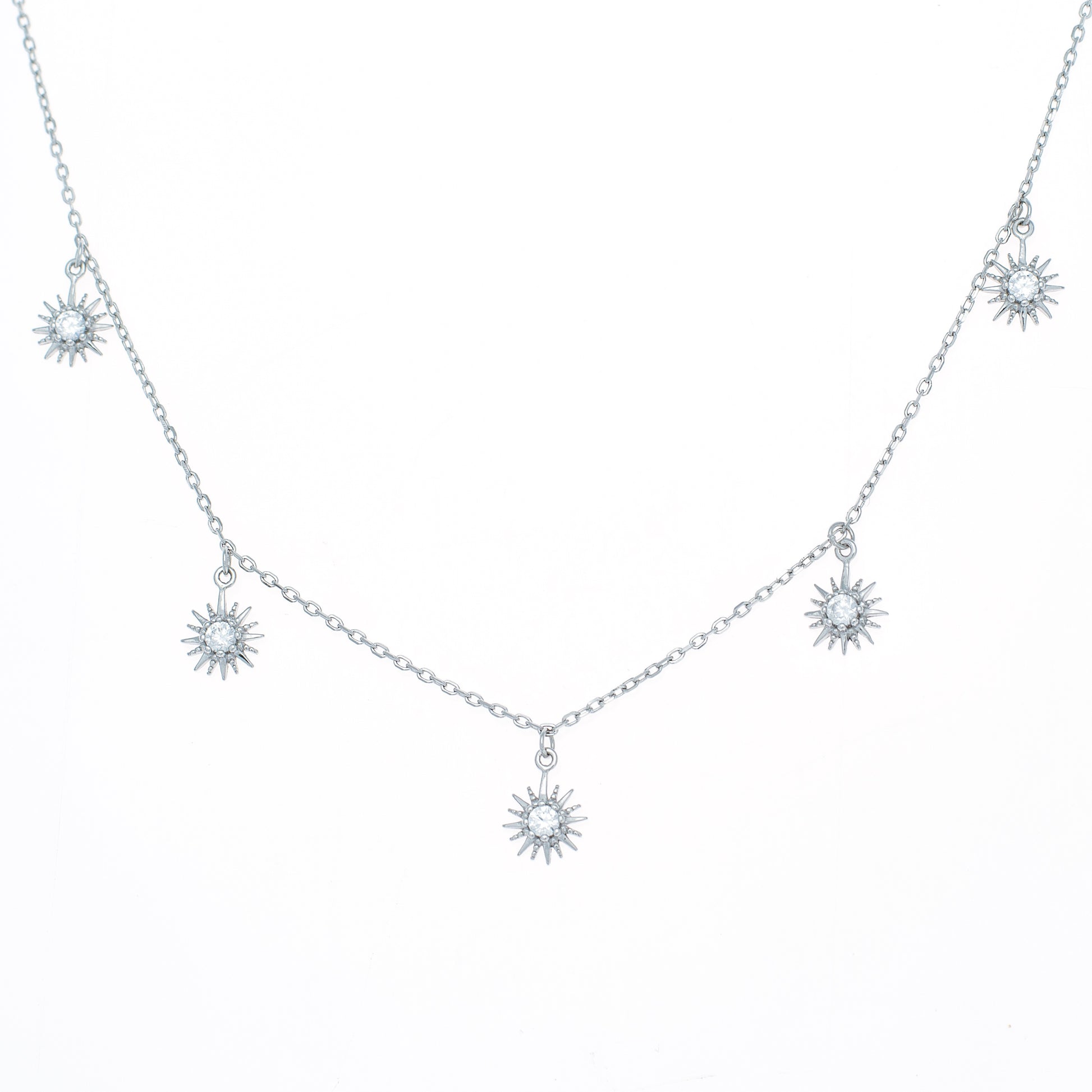 This elegant necklace features a delicate silver chain adorned with five sparkling sunburst charms. Each charm is designed with a central crystal surrounded by radiating metallic rays, creating a dazzling starburst effect. The charms are evenly spaced along the chain, with the center charm slightly larger, offering a balanced and eye-catching look. The light silver tone complements the brilliance of the crystals, making this piece perfect for adding a touch of celestial glamour to both day and evening wear. Ideal for those who love subtle yet statement-making jewelry with a celestial theme.