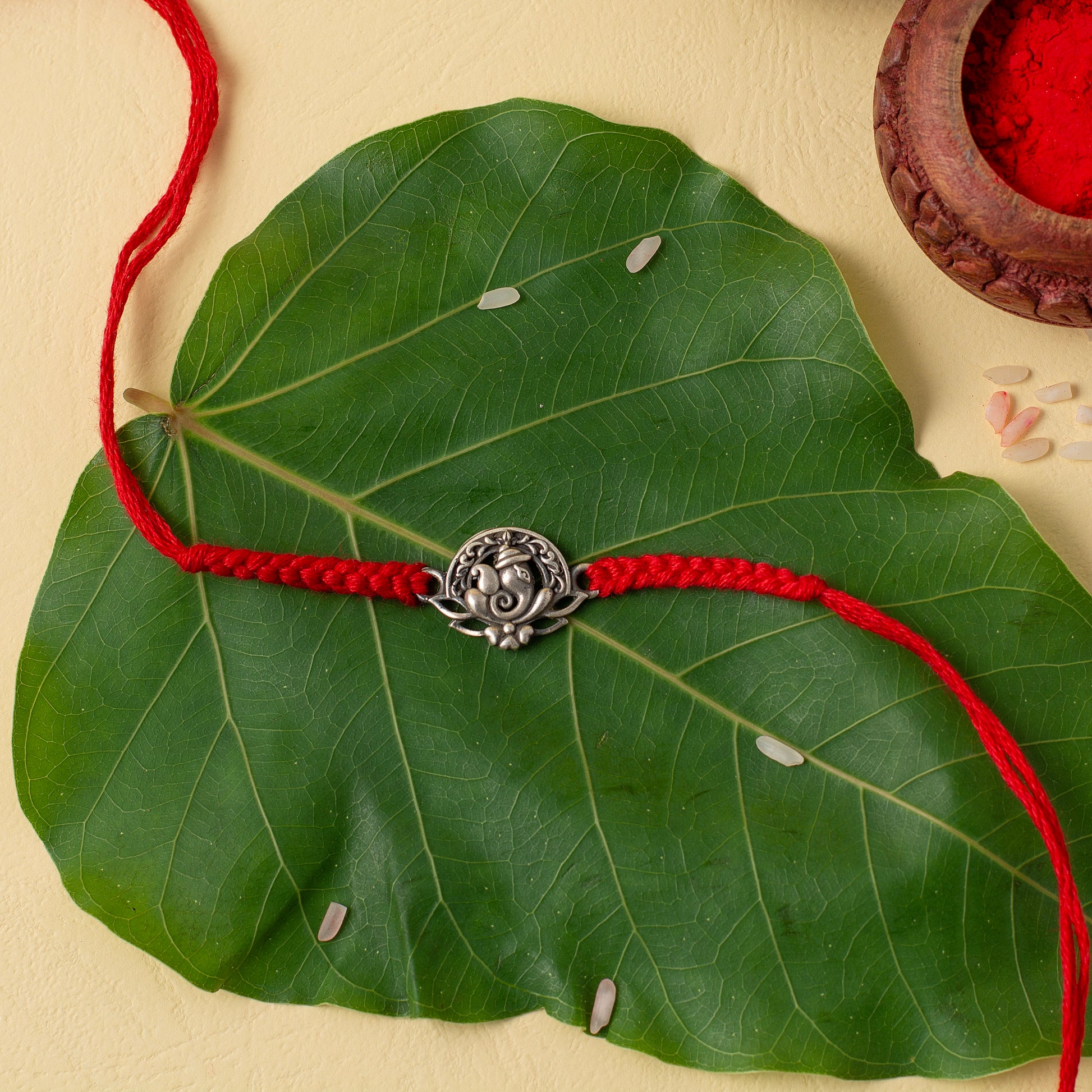 Imbue your Raksha Bandhan celebrations with the divine blessings of Lord Ganesha. This exquisite rakhi features a meticulously crafted Ganesha motif in silver, nestled on a vibrant red braided thread. The Ganesha charm symbolizes wisdom, prosperity, and the removal of obstacles, making it a meaningful and auspicious choice for this special occasion. Handwoven with love and care, this rakhi combines tradition with charm, making it a perfect token of affection for your brother. Let this rakhi be a guardian of your sibling bond, bringing joy and prosperity to your brother’s life.